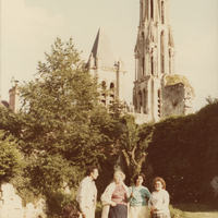 - Retrato de Madres de Plaza de Mayo en parque. Detrás se observa una iglesia gótica. Se identifica a Nora Cortiñas