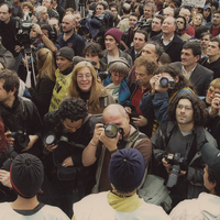 - Retrato de asistentes a manifestación. Se observa a camarógrafos y fotógrafos documentando el evento