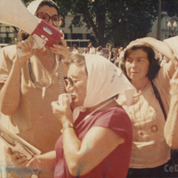 - Retrato de Madres de Plaza de Mayo en manifestación. Se observa a Nora Cortiñas hablando por un megáfono