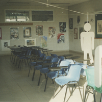 - Se observan siluetas de cartulinas colgadas dentro de un aula y obras artísticas pegadas en las paredes