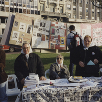 - Retrato de Nora Cortiñas y Margarita Peralta de Gropper en acto en la Plaza de Mayo. Se observa mesa con publicaciones y carteles detrás con imágenes e información de desaparecidos