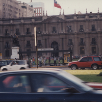 - Se observa una calle con bulevar y al fondo un edificio público con la bandera de Chile