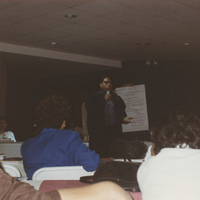 - Imagen de expositor y asistentes a un evento