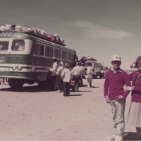 - Retrato de Nora Cortiñas junto a un jóven. Detrás se observan ómnibus cargados de bolsos en sus techos