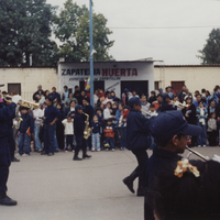 - Registro del desfile de banda militar de música. Se observan niños y jóvenes tocando instrumentos de viento