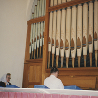 - Imagen de Nora Cortiñas junto al organista de una iglesia