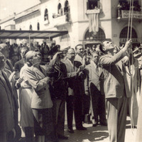 - Juan Domingo Perón iza la bandera. Aparece también Eva Duarte de Perón