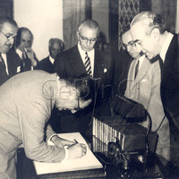 - Epígrafe: El presidente de la Nación, general Juan D. Perón, firma el libro de visitantes en la Universidad de Córdoba, estando presentes el interventor de dicha casa de estudios y otras autoridades