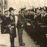 Juan Domingo Perón saluda a la tripulación del buque escuela "Almirante (no se entiende la palabra)