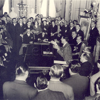- Discurso de Juan Domingo Perón, están los ministros de salud pública y de educación Ramón Carrillo y Armando Méndez San Martín
