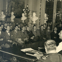 - Epígrafe: El presidente de la República, general Juan Perón, dirige la palabra a una numerosa delegación del Radio Club Argentino, reunida en el Salón Blanco de la Casa de Gobierno. Asistieron además a la ceremonia, los ministros de Comunicaciones y de Defensa Nacional; el presidente de la Cámara de Diputados y el titular del bloque peronista de ese cuerpo. Año del Libertador General San Martín