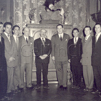- Epígrafe: El general Juan Perón, rodeado de los estudiantes ecuatorianos durante la visita que le realizaron esta mañana y el ministro de Educación, doctor Armando Méndez San Martín