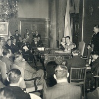 - Epígrafe: El primer magistrado, general Juan Perón con los miembros del Consejo Federal de Seguridad, en la reunión celebrada esta mañana en el Salón de los Escudos del Ministerio del Interior