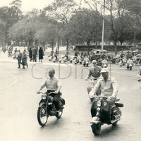 - Juan Domingo Perón conduce un ciclomotor (con el gorrito de béisbol).