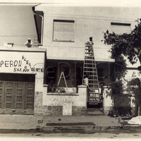 - Hombres limpian las pintadas del frente de una casa de Vicente López. Pintadas: "Juan Domingo Perón PRESIDENTE" "5X1"