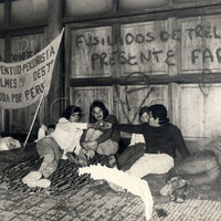 Jóvenes cerca de Gaspar Campos. Pintadas: "FAR PRESENTE"