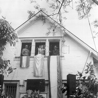 María Estela Martínez de Perón habla desde la ventana de la casa de Gaspar Campos. Están Juan Domingo Perón y Héctor José Cámpora