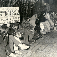 - Gente sentada frente a la casa de Gaspar Campos. CARTEL "LA CUSTODIA DEL GRAL PERÓN ES SU PUEBLO CONCENTRARSE Y NO DEJARLO SOLO. LA VIDA POR PERÓN"