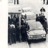 - Tres autos estacionados. Gente debajo de un techo. Un señor con una cámara de fotos grita. Detrás de éste, un señor con anteojos negros.