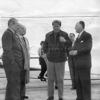 - Epígrafe: El jefe del Estado, general Perón, con los ministros de Obras Públicas, ingeniero Dupeyron y de Educación, doctor Méndez San Martín; el secretario de Prensa y Difusión de la Presidencia, señor Apold, y el señor Atilio Renzi, después de visitar hoy obras de dragado que se realizan frente a la Quinta Presidencial de Olivos