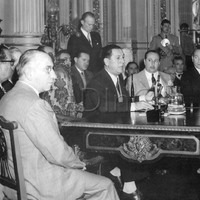 - Epígrafe: El presidente de la Nación, general Perón acompañado de ministros y otras altas autoridades, durante su discurso