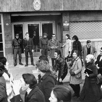 Columna de manifestantes reclama la libertad de Enrique Oscar Rusconi, acusado por participar en actividades militantes de izquierda. En un recorte de diario, que acompañan las fotos, aparece que en 1974 Enrique Oscar Rusconi "fue muerto a tiros"...